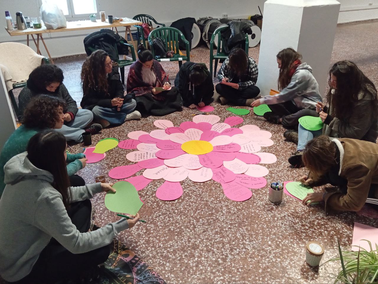 Vam crear un espai agradable i acollidor per a que les persones anessin arribant. Estores, coixins, flors i colors. A l’espai hi havia 3 racons: Un racó pròxim a l’entrada amb el registre, un racó on poder escriure els petals per colocar a la flor i un cercle de coixins i cadires al voltant de la flor enmig de la sala. Una flor que ja venia de la jornada d’Eivissa, Formenteria i Mallorca i on s’hi van anar sumant els petals de Menorca. És una flor d’aprenentatges individuals i col·lectius, cada persona en arribar colocava un petal rosa amb aprenentatges personals que han assolit durant aquest 2025 i en un segon petal verd quins aprenentatges col·lectius. D’aquesta manera, al final de la jornada, podiem apreciar “el creixement invisible” que s’està donant.